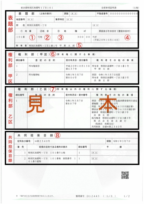 - 表題部(ひょうだいぶ) … 土地や建物の基本情報