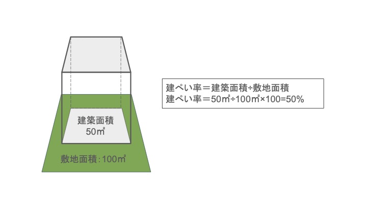例えば、敷地面積が100㎡で建築面積が50㎡の場合、建ぺい率は50%となります。