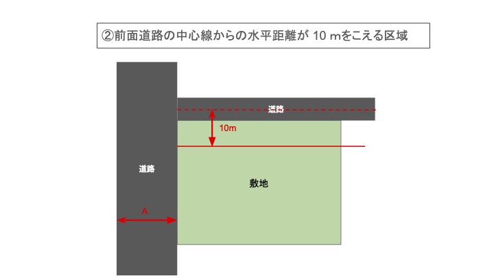 - ②前面道路の中心線からの水平距離が 10 mをこえる区域