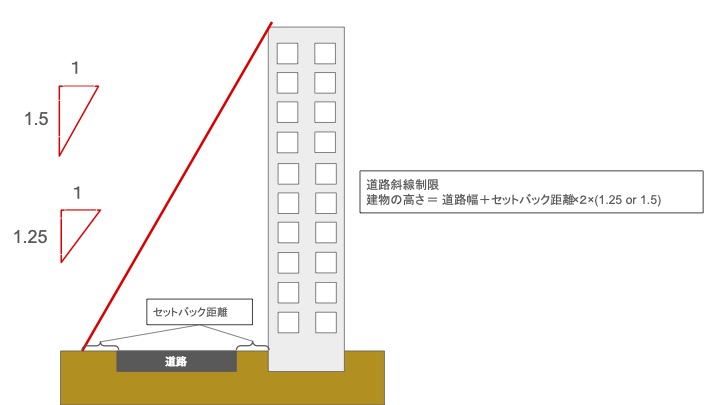 建物の高さ = 道路幅+セットバック距離×2×(1.25 or 1.5)