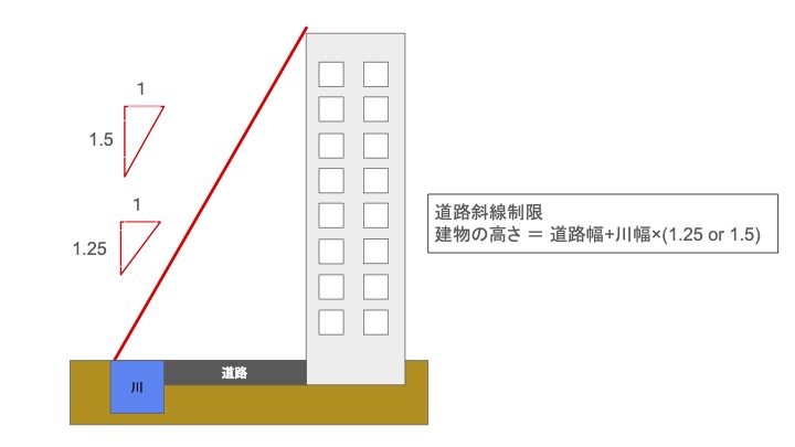 建物の高さ = (道路幅+川幅)×(1.25 or 1.5)