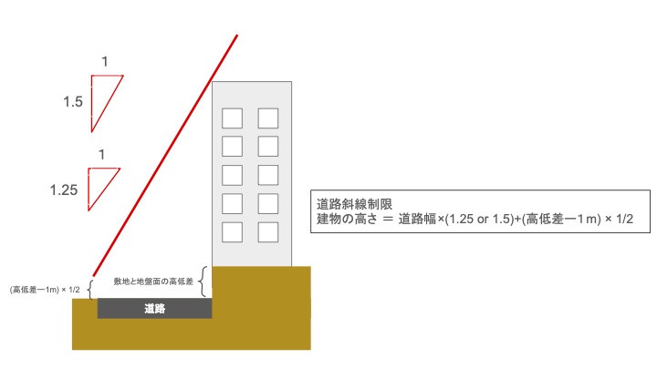 建物の高さ = 道路幅×(1.25 or 1.5)+(高低差ー1m)× 1/2