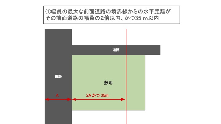 - ①幅員の最大な前面道路の境界線からの水平距離がその前面道路の幅員の2倍以内、かつ35 m以内