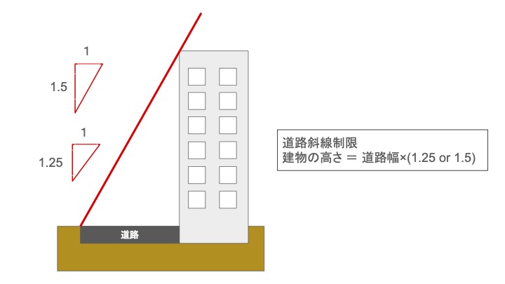 道路の反対側から 1.25倍もしくは1.50倍の勾配 で制限がかかるのが一般的です。